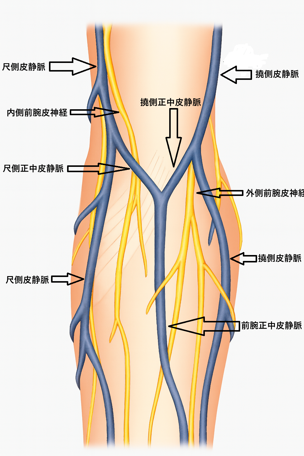 そのため、まずは撓側皮静脈、前腕正中皮静脈を最初に探すとよい。
