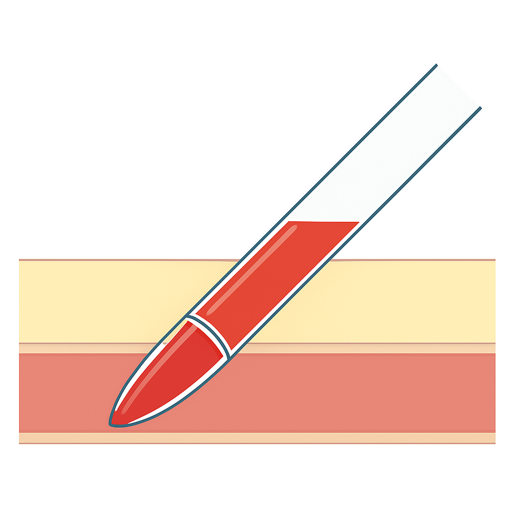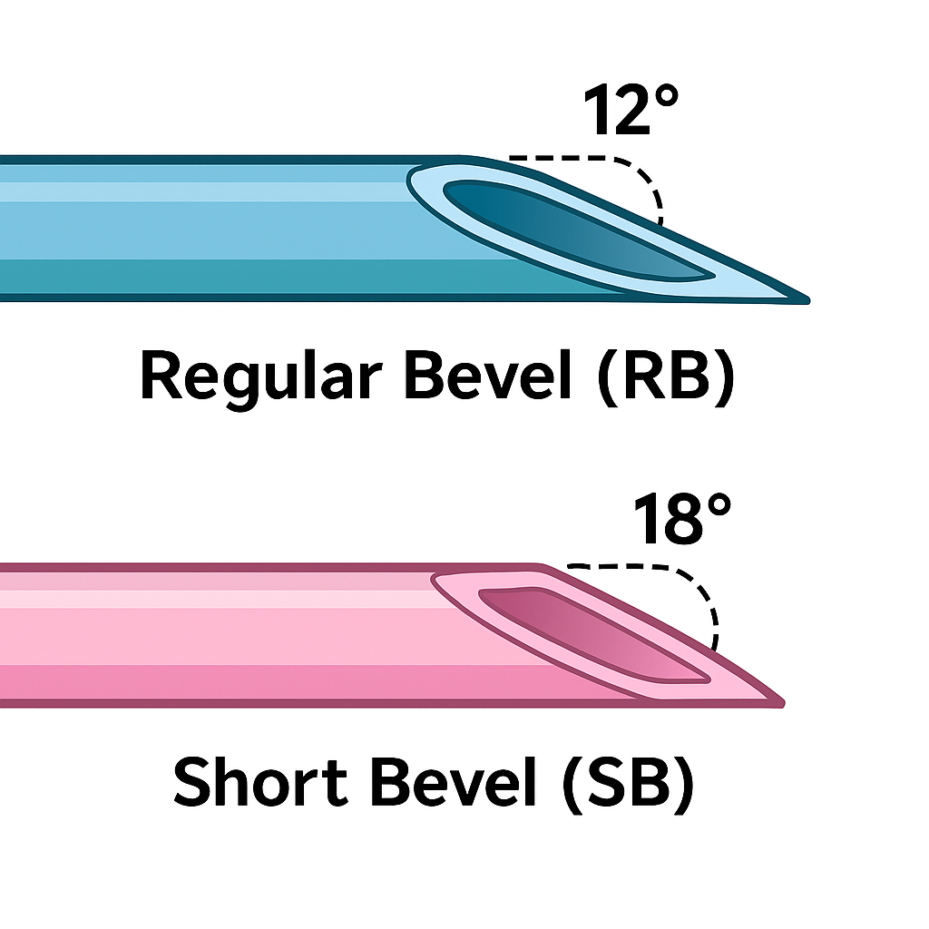 ・SB(ショートベベル):針先を18度とやや急勾配で抵抗が大きく切れ味が鈍くしている。それにより血管を過度に傷つける可能性を減らす。