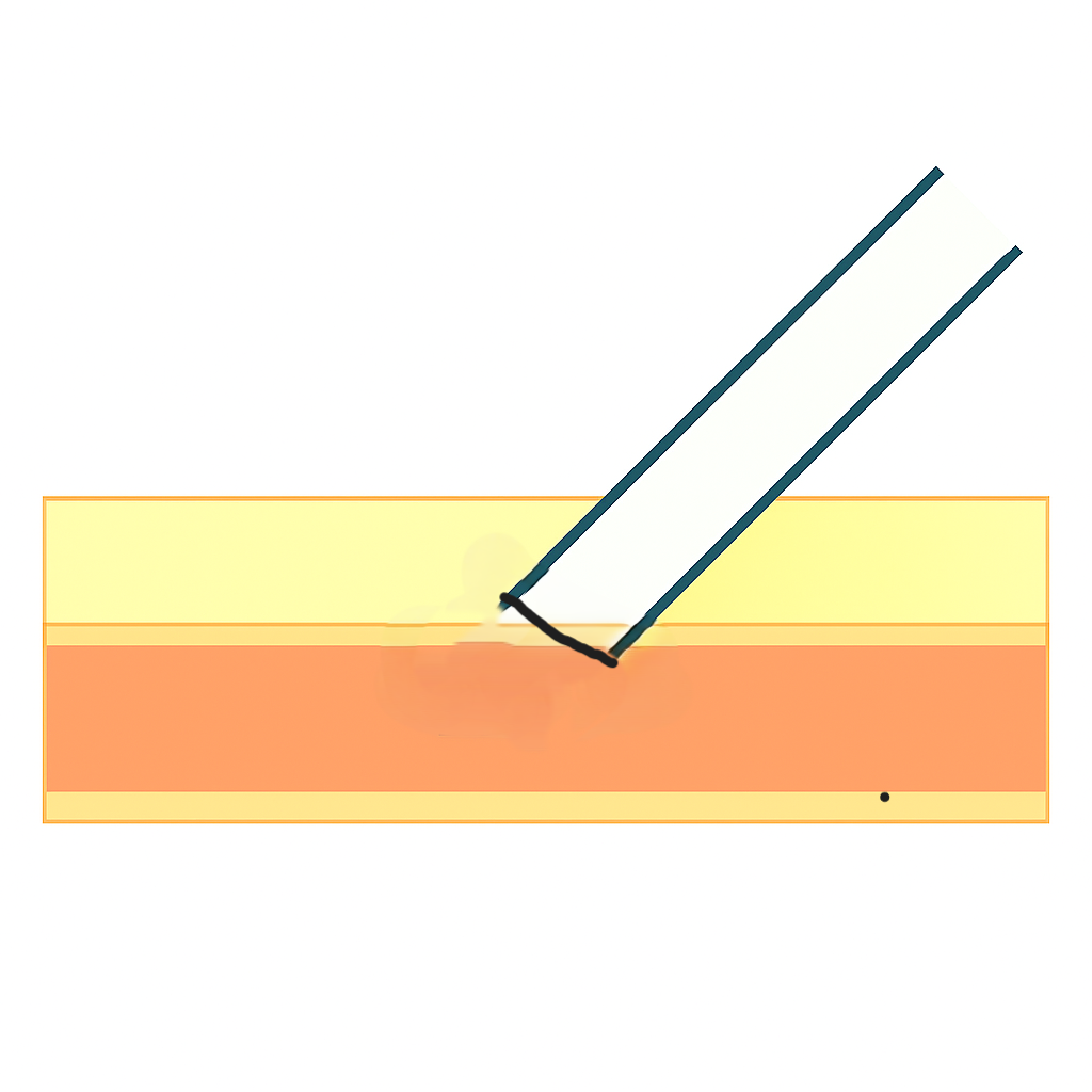 ・硬膜外針の刃面を患者の頭部に向けて、皮膚から垂直に刺します。