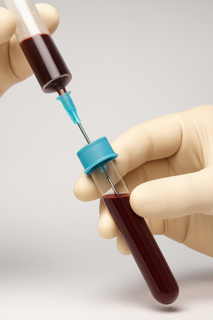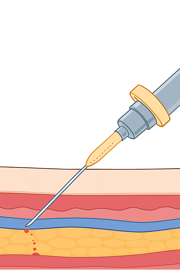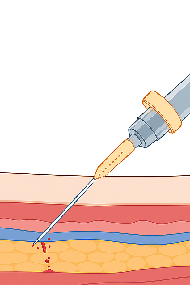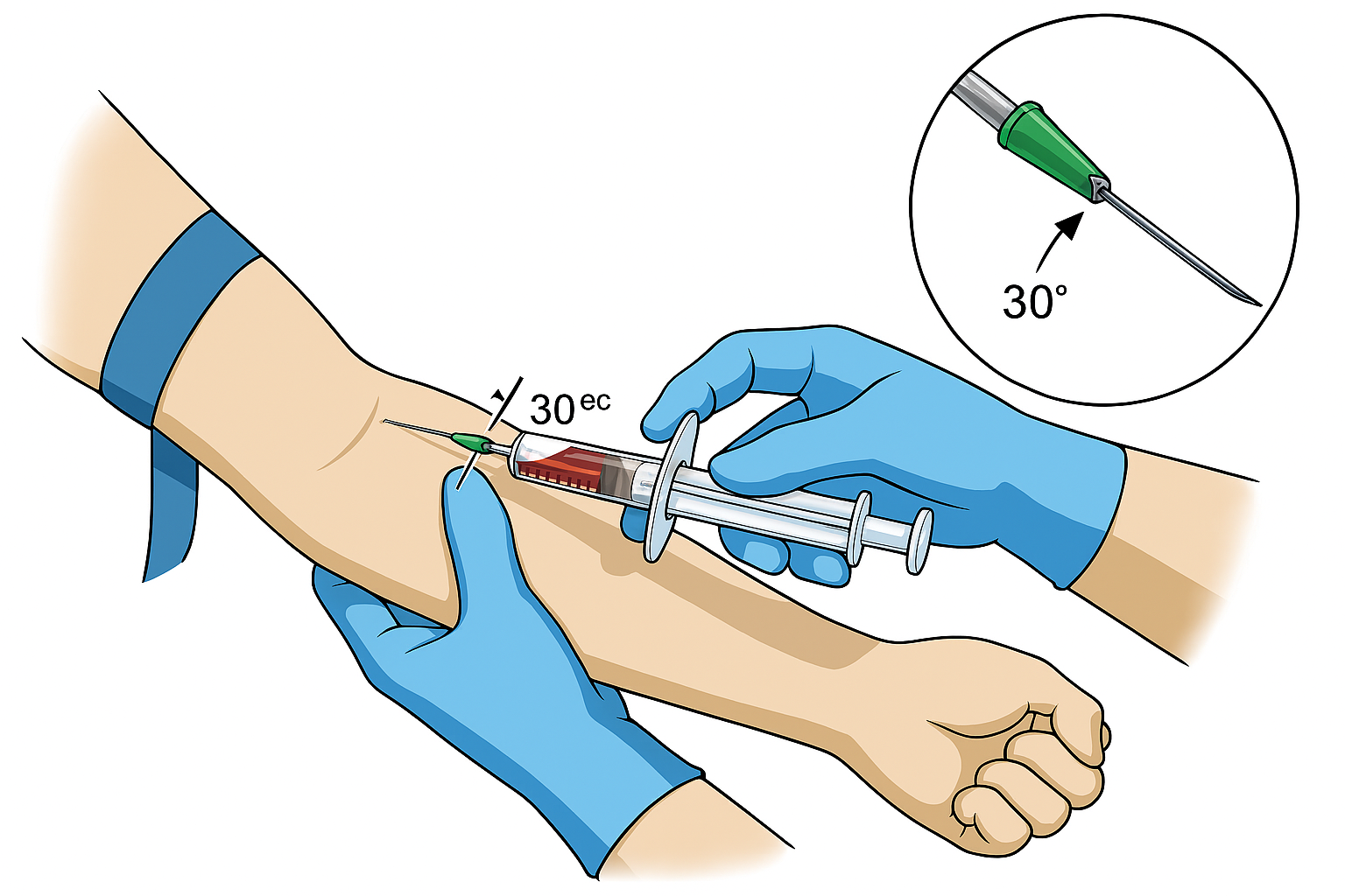 4. 穿刺と採血:針を皮膚に対して約15〜30度で挿入