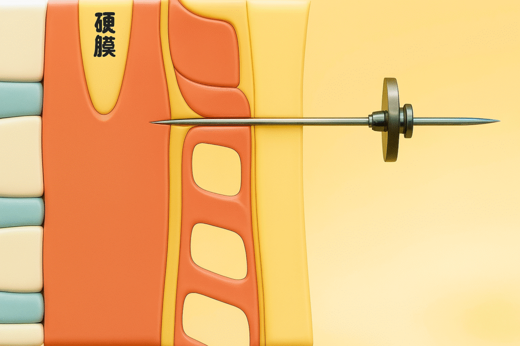 ・針を進めていくと、黄色靭帯を越える際に抵抗感が増し、その後に抵抗感が消失するポイントで、硬膜外腔に達したことを確認します。