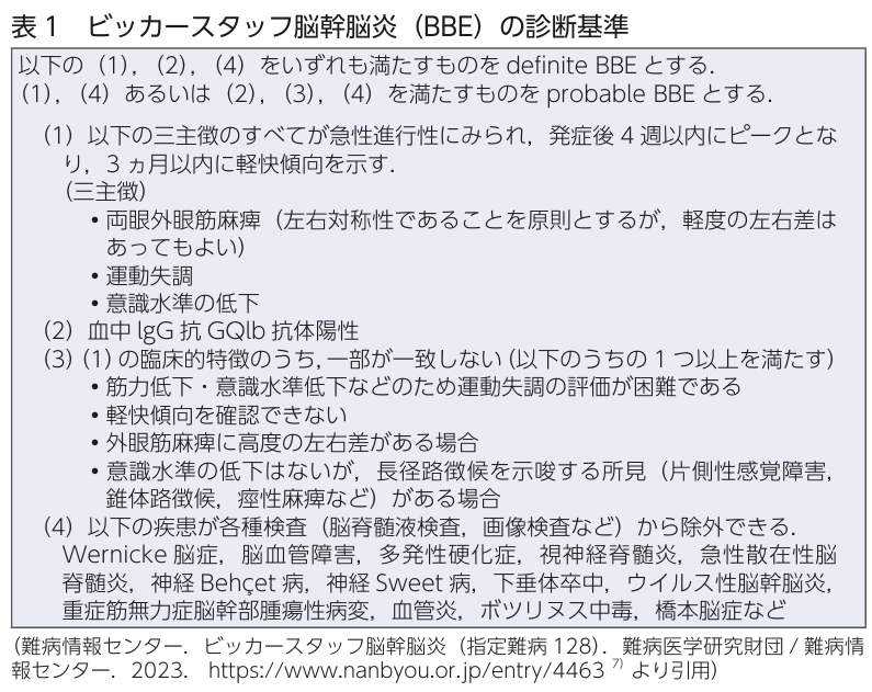 | Bickerstaff 型脳幹脳炎 | ・意識水準の低下 ・錐体路兆候 |